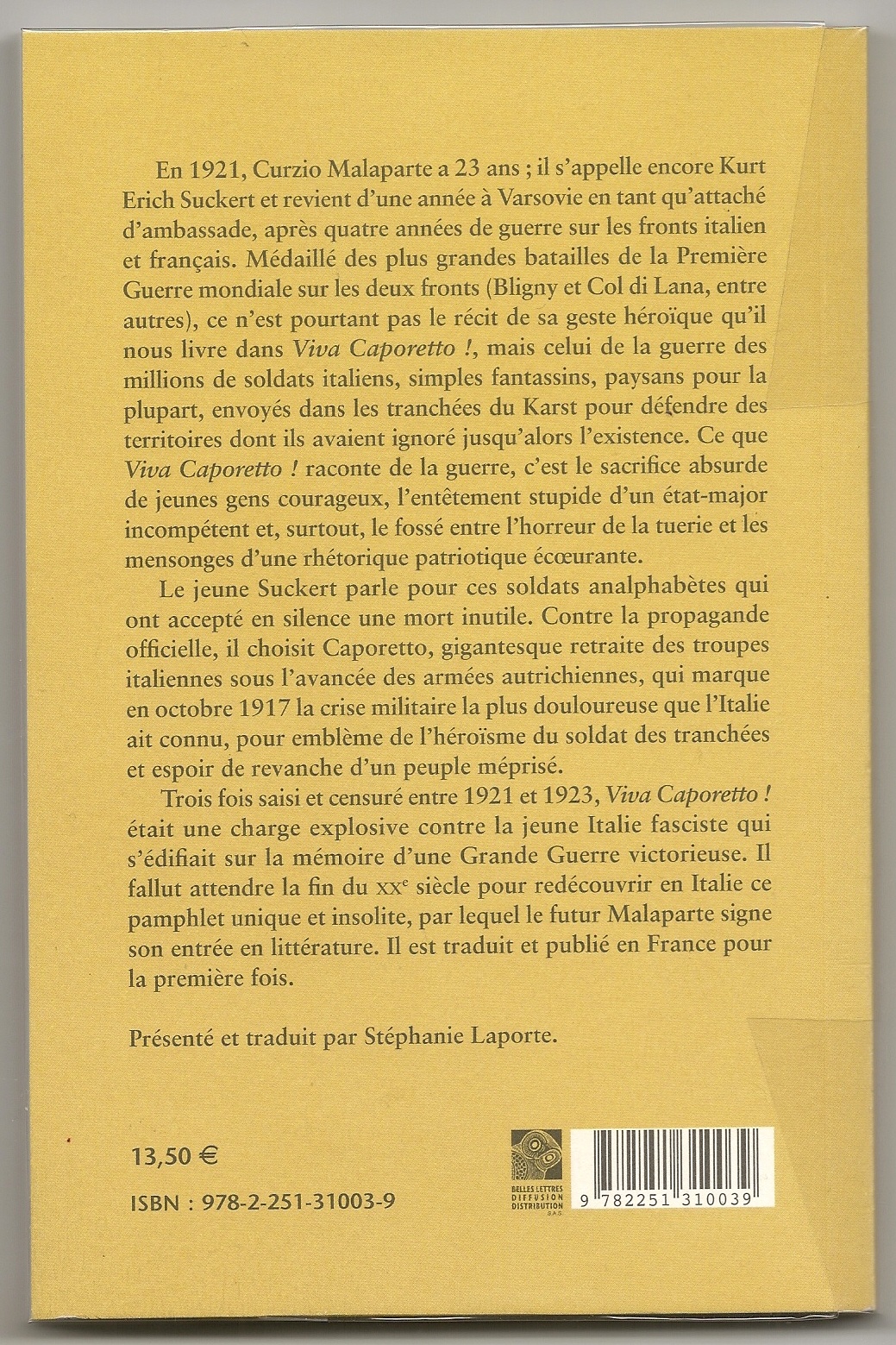 Mieux qu'un témoignage cet essai-pamphlet est une façon de rendre compte de la guerre par quelqu'un qui en fut un "héros". Ce premier livre de Malaparte qui vient seulement d'être traduit en français - félicitons-en Stéphanie Laporte et les Belles Lettres -, peut paraître un peu sec dans les premiers chapitres. Progressivement pourtant s'affirme le futur auteur de Kaputt avec son ironie grinçante, désespérée et somptueuse. Ce livre est une gifle à tous les va-t-en-guerre de l'arrière, députés, journaleux, généraux et autres publicistes de mauvais alois. Reprenant les causes de Caporetto, Malaparte dénonce sans faillir l'incroyable façon dont les pseudos élites italiennes ont traité le fantassin - viande à boucherie - dans l'armée italienne. C'est un réquisitoire contre la connerie et la lâcheté ordinaire mais qui, comme toujours chez Malaparte, va plus loin et tente de plonger dans les racines profondes du mal. Plus ou moins semblables, c'est ce que l'on pourrait dire de la situation dans les autres pays de ce conflit. Qu'on se souvienne des 300 000 morts du début de guerre, de Joffre (nommé en récompense Maréchal de France), des morts de Nivelles et Mangin, de la Somme et des deux Verdun, des fusillés "pour l'exemple !" - quel exemple ? - ... Jamais on ne dira assez le crime incroyable de stupidité de cette guerre ignoble où les incompétences et la saloperie des politiciens et des journaleux le damnait à celle des militaires de haut rang. Il n'y a eu de traitres nulle part dans cette guerre, et le droit de ne pas se faire tuer, de ne pas tuer, est le droit le plus élémentaire de l'homme, pas reconnu par les Droits de l'Homme actuels. Chaque peloton d'exécution, tous les gendarmes venant chercher des réfractaires, étaient des criminels auteur de crimes contre l'Humanité. Les Poincaré, les Clémenceau, les Barrès, n'étaient que des petites ordures, des assassins lâches se cachant derrière l'alibi honteux de la Patrie. Ni la France, ni l'Allemagne, pas plus que les autres n'étaient des Patries, seulement de basses putains, ce qu'elles sont encore aujourd'hui.