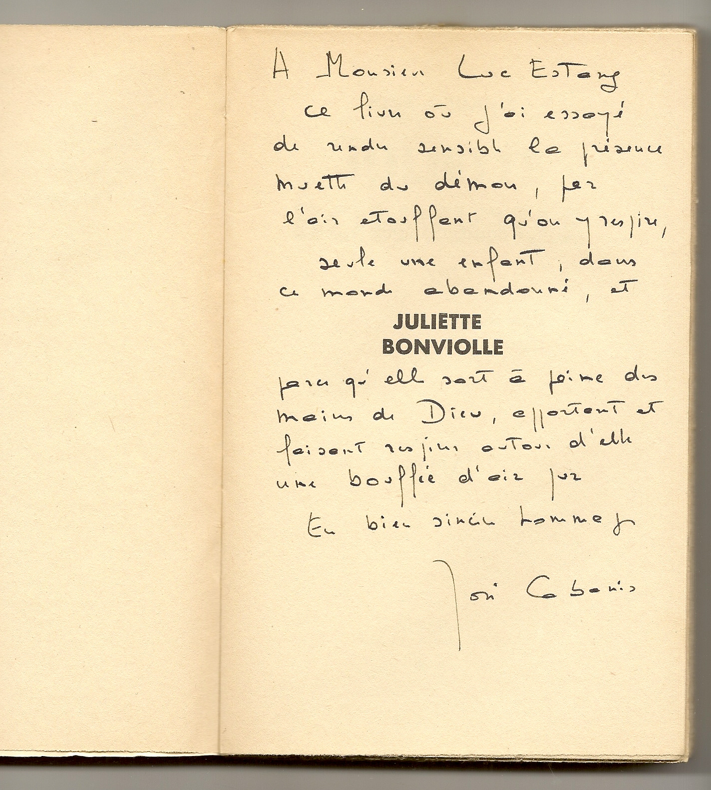 José Cabanis. Intéressante dédicace qui révèle une intention de l'auteur qui